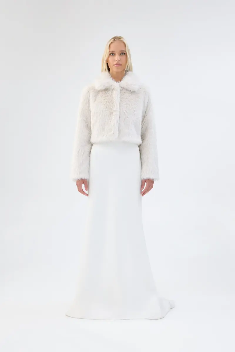 Available in a variety of ivory and nude tones, these jackets are the perfect way to add a touch of personality to your wedding day look. A fake fur jacket is not only stylish but also a conscious choice, allowing you to stay comfortable while being eco-friendly. Whether you’re looking for something understated or dramatic, bridal coats like these offer a seamless blend of practicality and fashion, ensuring you stay warm while looking stunning on your big day.