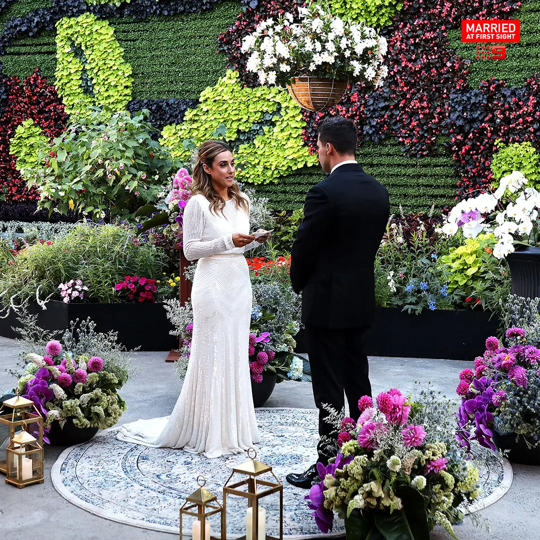 Kerry and John stand at their commit ceremony on MAFS Australia where she wears the stunning Cassie gown, a long sleeve high neck beaded wedding dress.