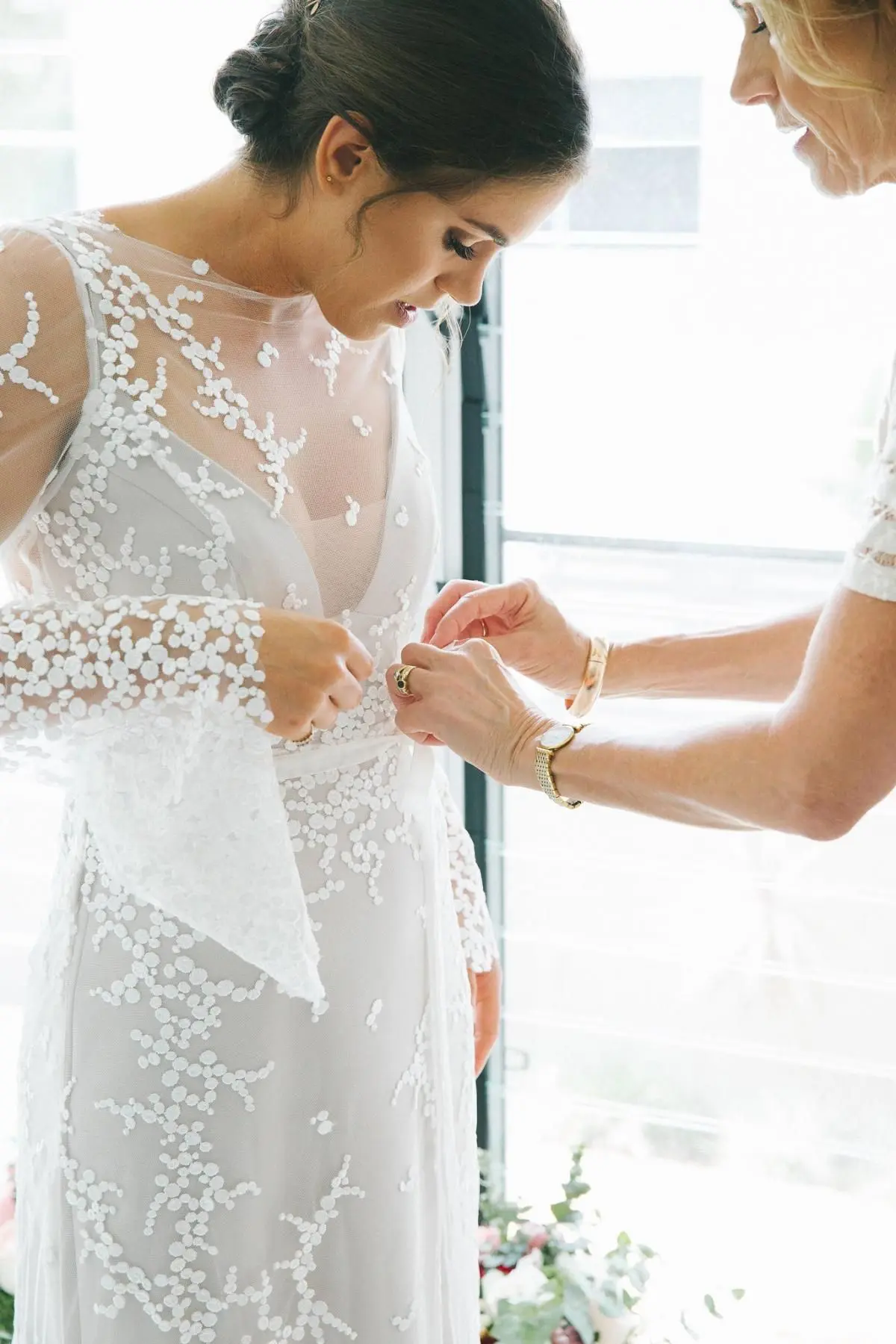 The moment that Sophie tried on the Pascale gown from our BESPOKE collection, she immediately fell in love with it. It was the first sleeved gown that Sophie had tried on at our Melbourne boutique and she loved the unique and understated lace and the flared sleeves. “The flared sleeves just absolutely made the dress – it made me feel like Stevie Nicks, a musician I’ve always loved! As soon as I came out in the gown, my friend gasped, and I turned and looked in the mirror and I could feel butterflies in my stomach and my eyes started welling up.”