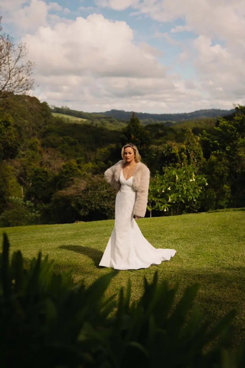 The Balmain gown can be styled in many ways. She looks incredible with a statement veil like our 2 tier Chantilly Lace veil. Alternatively, opt for a more simple style like our Honor veil.