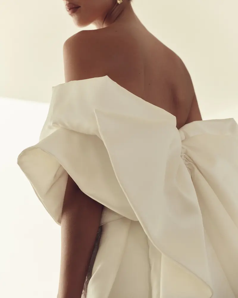This long, statement train is draped in Mikado and features large puff sleeves that act as a bow detail to offer a dramatic entrance and the most gorgeous photos!