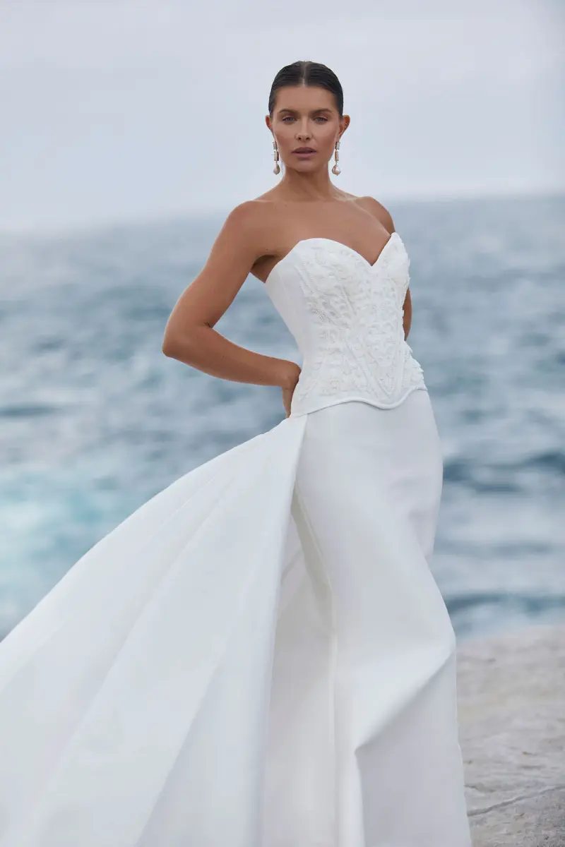 Styled here with our detachable Kai Train, the Constance & Maya gown makes for the ultimate princess wedding dress by day, and statement fitted dress by night.