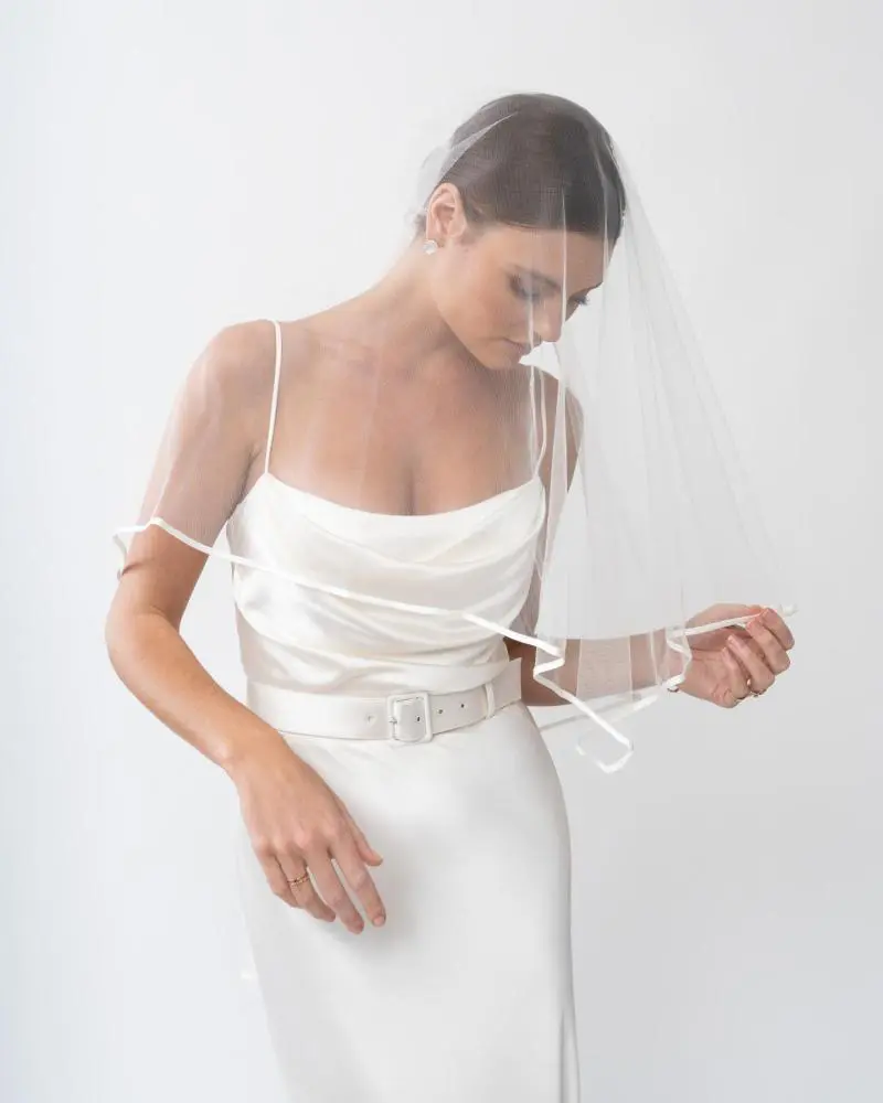 The Florence Veil is modern simplicity, a fresh take on traditional. This ivory tulle wedding veil is edged with satin ribbon for a subtly bold touch. Florence also has the option for you to wear the blusher down the aisle, or wear it back as a double layered look for a more contemporary feel.