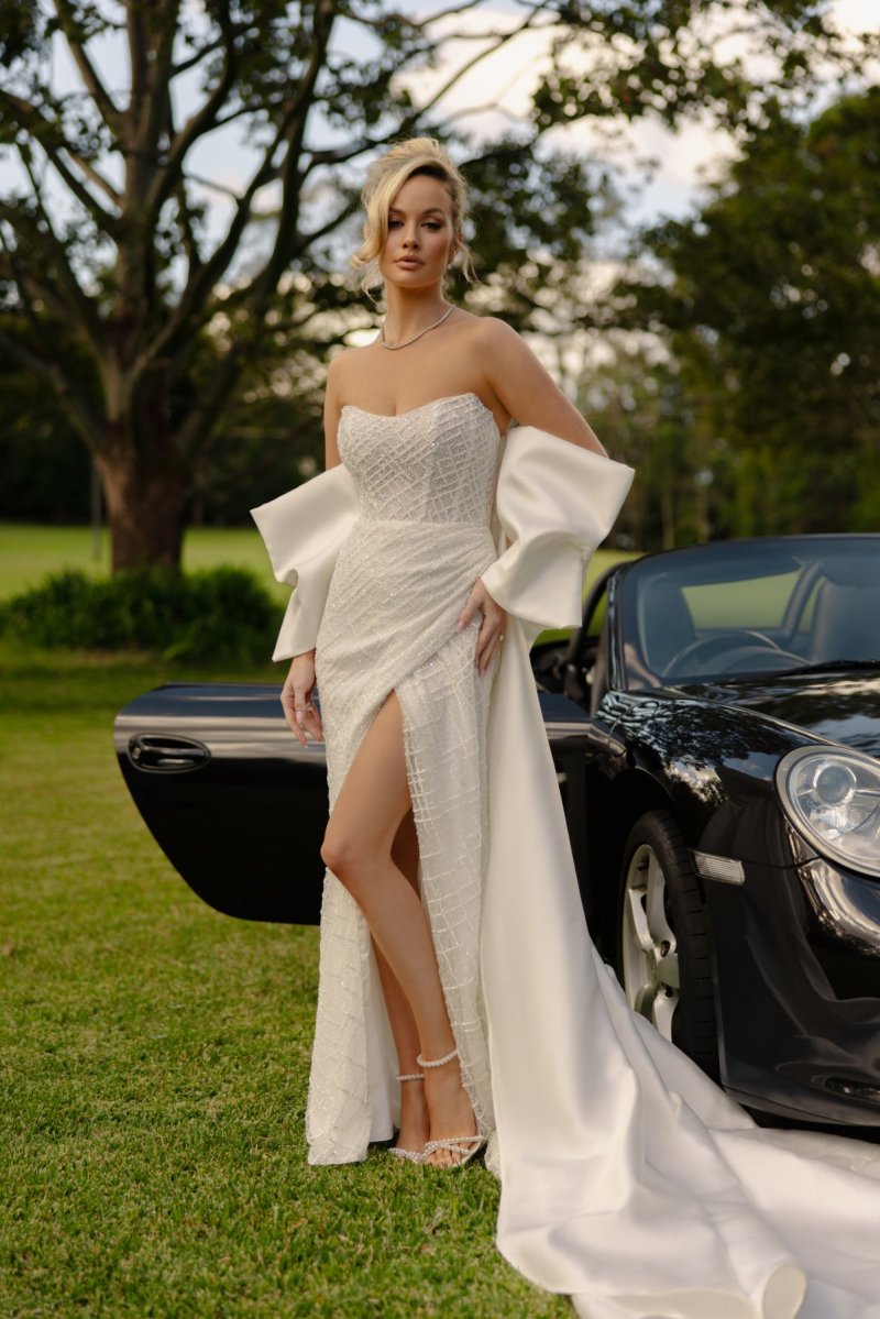 The Genevieve features elegant hand beading reminiscent water droplets, or swirls of a waterfall. Designed to catch the light at every angle, it is truly a design that has to be seen to be believed. The direction of the beading elongates your body, and is perfect for brides who want to show off their shape, without revealing too much.