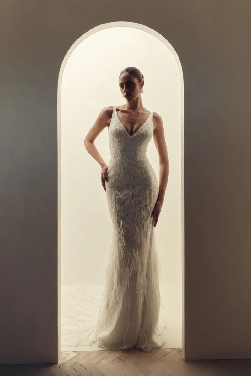 Adding to this amazing design, are fine ostrich feathers that scatter along the base of the skirt. This provides the most delicate and floaty air to the gown, while reveling in the luxurious nature of such a timeless beaded wedding gown.