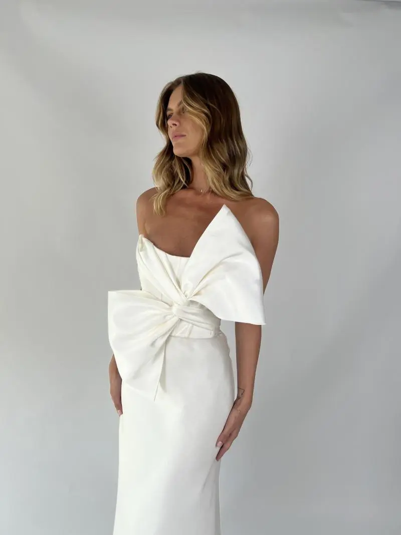 Step into ultra modern wedding dress fashion in this stunning gown. The Ines & Karly will have people talking about your one of a kind wedding dress with bow detailing for years to come!
