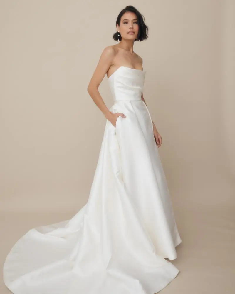The Elizabeth skirt is an updated version of our Camille skirt. Featuring box pleats framing a centre front panel. Not to mention, a modern side split to show off your leg when walking, and side pockets! Elizabeth is perfect for brides who want a ballgown wedding dress, but don’t want ruching or gathering adding too much volume. Plus, the side split and pockets mean you can wear a statement shoe, and don’t need to worry about a clutch!