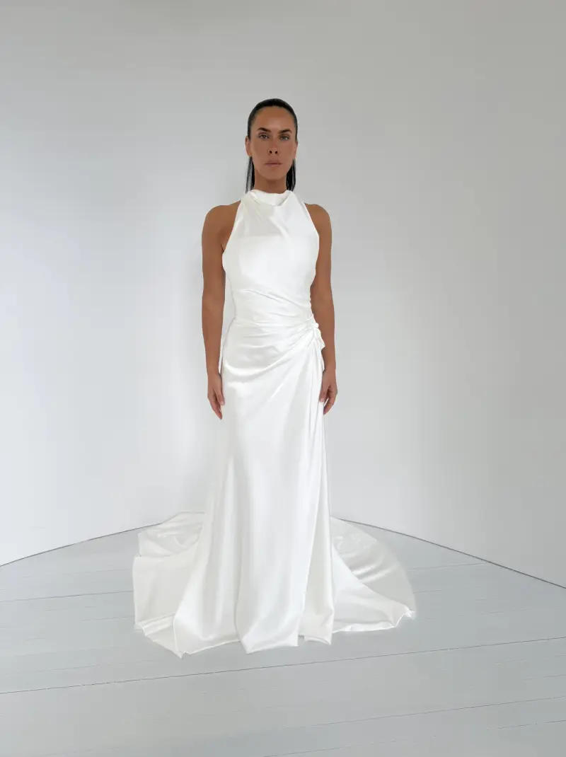 The wait is over, introducing the most stunning satin halter neck wedding dress of the decade! Meet the one, the only, Peyton! Double boned and full of structure, this hand draped halter neck meets boat neckline gown is our new fave of all time (and the best on the market)!