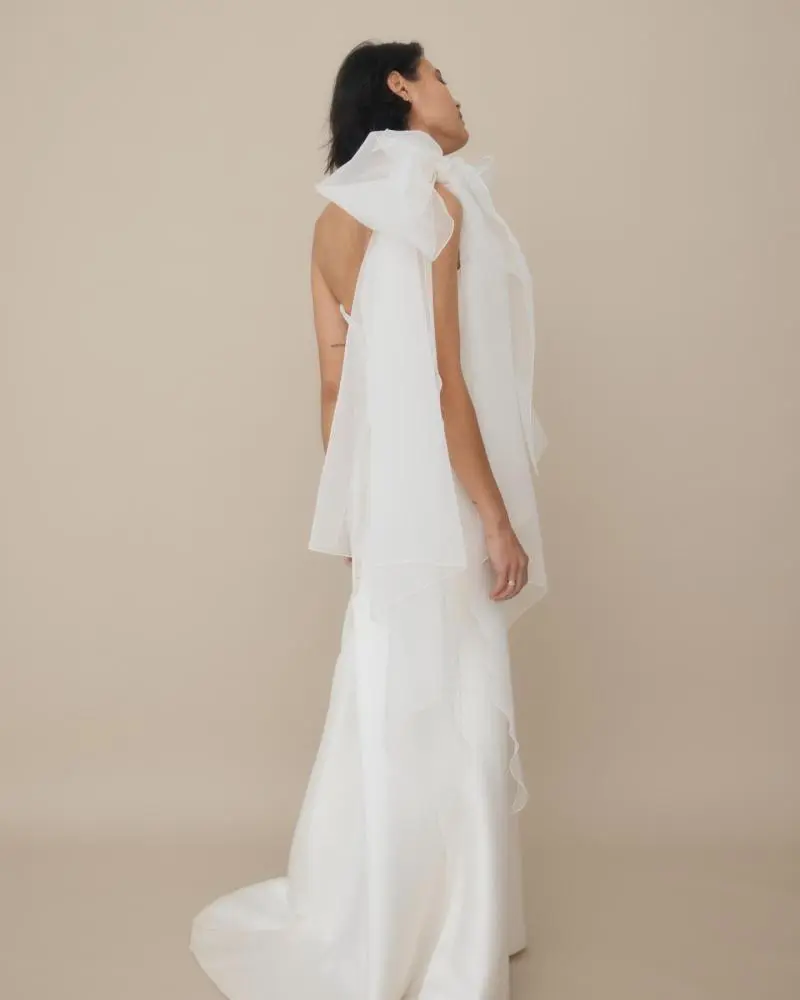 The Sabrina Organza Shoulder Bow is a feminine statement and can be worn with any KAREN WILLIS HOLMES gown with a strap. Draped in luxurious organza, this full bow is what you have been looking for to complete your wedding day look. For a more simple look, this bow can also be worn attached to the back of a gown!