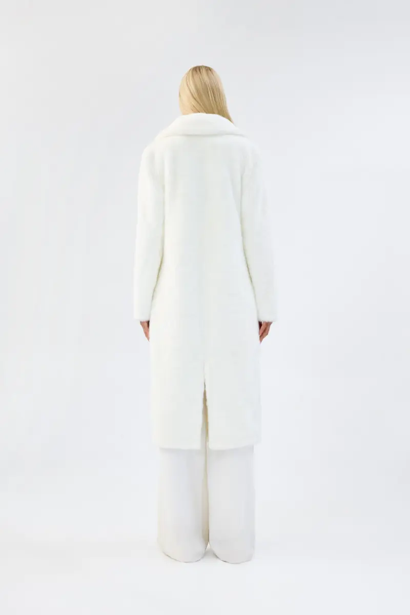 - Trim Details: Plush faux-fur exterior, notch lapel collar, back vent, concealed snap closures