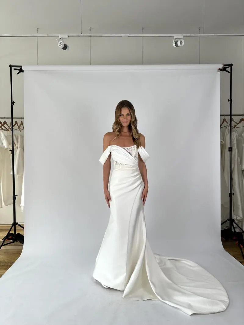 The Victoria & Emily is perfect for a garden wedding or chapel ceremony. Her off shoulder draping allows enough movement for you to still party all night long. Choose between a button closure or lace-up closure on the Victoria Bodice to further customise your look.