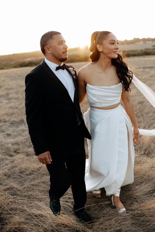 Amy looked beautiful in the Lou Lou Crop & Gianna Skirt rom our Bespoke collection. The Lou-Lou crop & Gianna gown is modern fun, flattering gown made from luxurious Mikado, featuring a scoop neckline and sculptured hand draping. The Lou-Lou Bralette features statement draping over a stunning cropped corset, perfect for the bride who wants a modern twist on a classic style. With a statement button back, and support under-bust band, you will be comfortable all day long! The Gianna Skirt features matching draping, that continues the line from bodice to skirt. Not to mention, a modern side split to show off your leg when walking, and side pockets! Gianna is perfect for brides who want a ballgown wedding dress, but don’t want ruching or gathering adding too much volume. Plus, the side split and pockets mean you can wear a statement shoe, and don’t need to worry about a clutch!