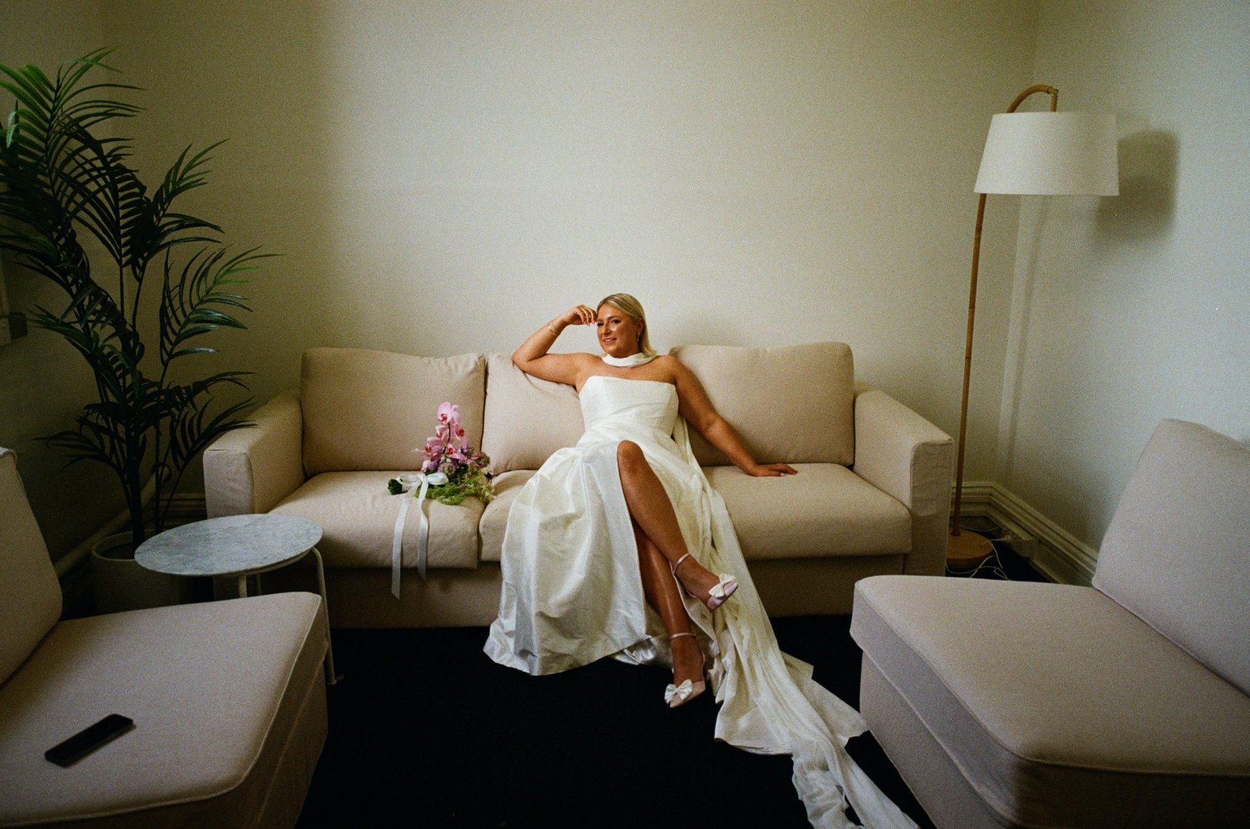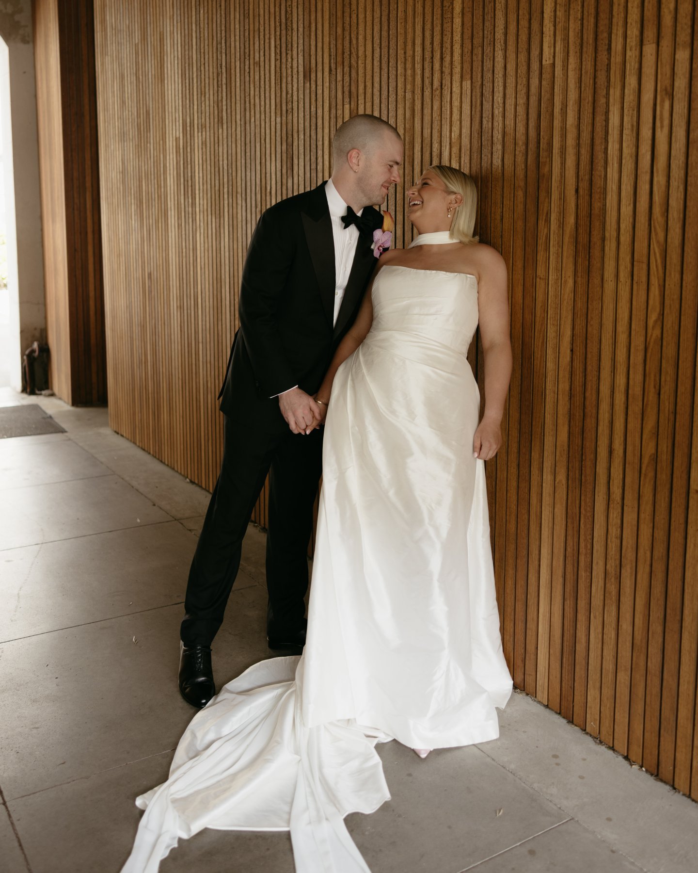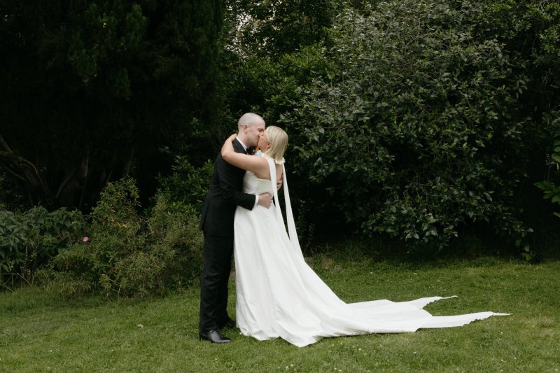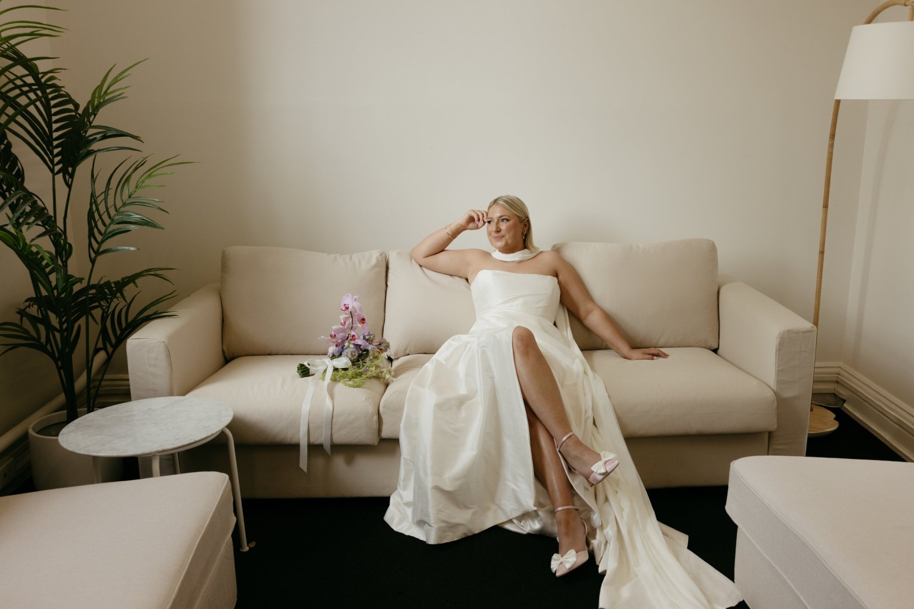 For the bride who wants the ultimate classic silk wedding dress, look no further than Emma. Chloe chose this gown for its refined elegance and fashion-forward simplicity, a piece that whispers sophistication but photographs like a dream. The stunning hand draping across the corseted bodice hugged her figure beautifully, elongating her shape before flowing into a timeless A-line skirt with a daring (yet tasteful) side split. It’s the kind of silhouette that moves as you move, dramatic in stride, poetic in stillness.