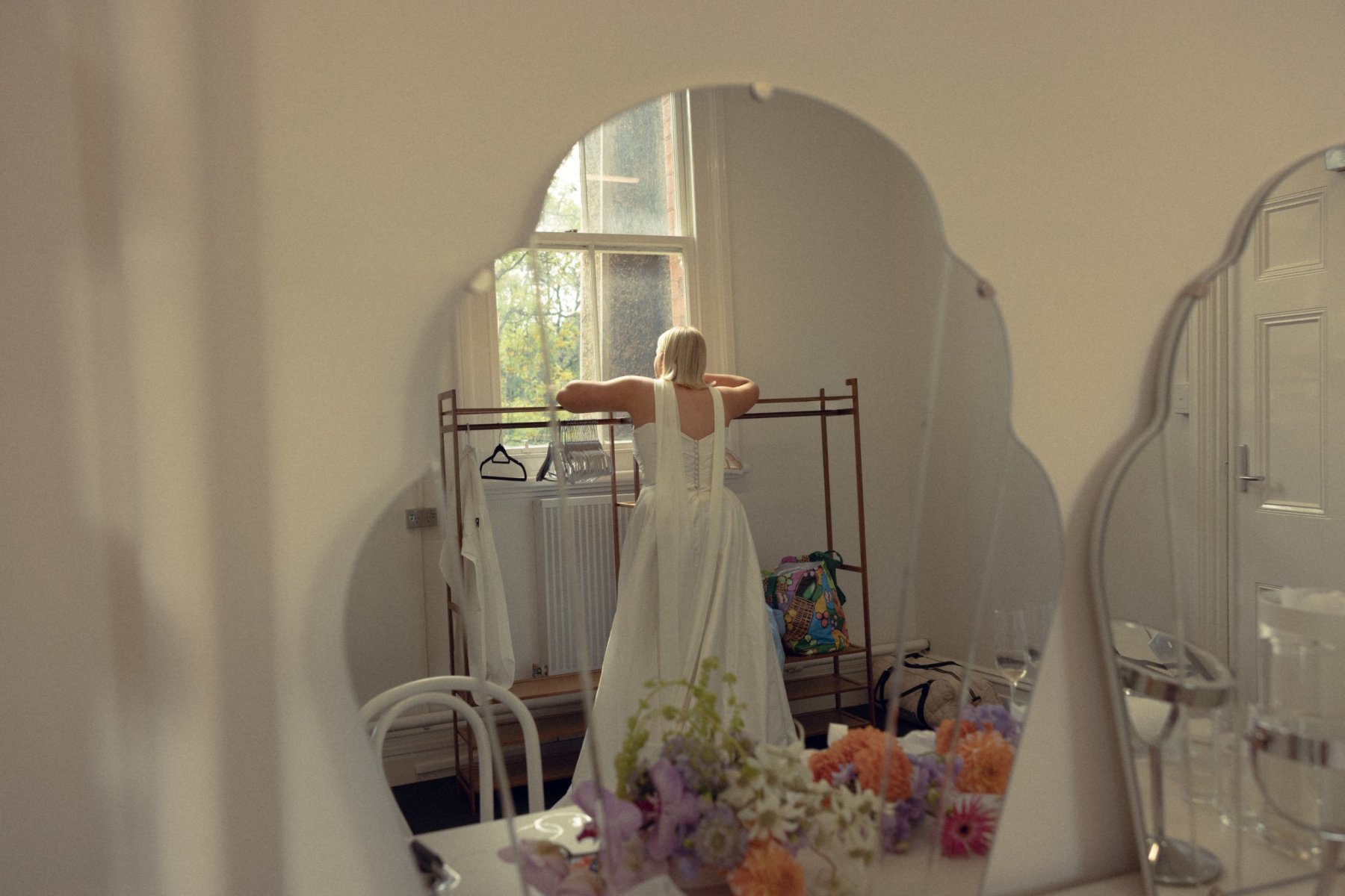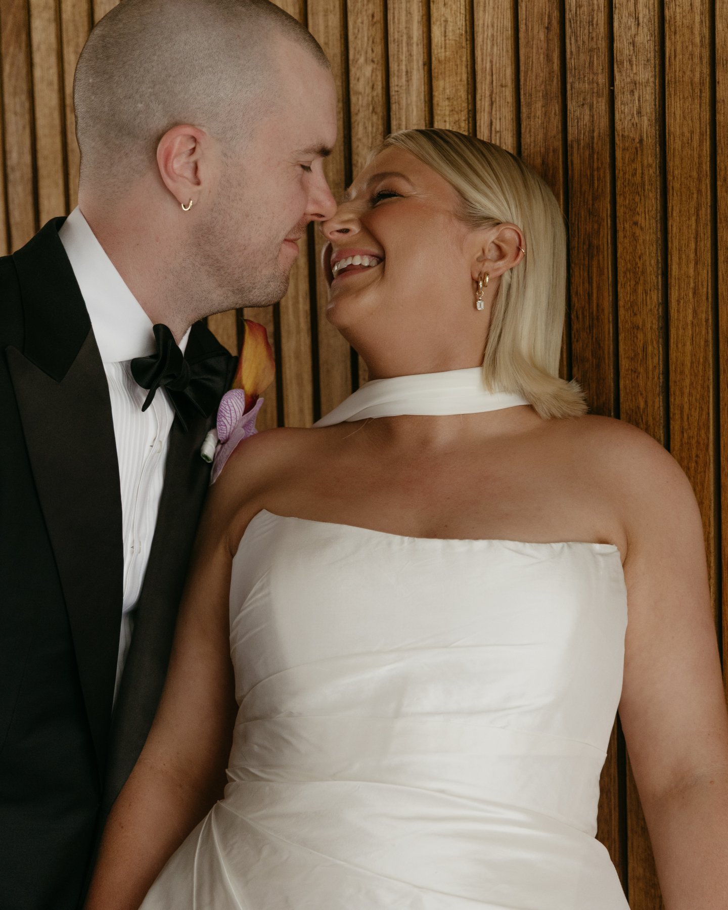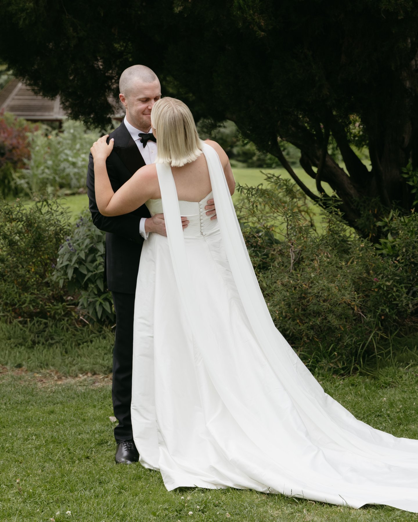 For the bride who wants the ultimate classic silk wedding dress, look no further than Emma. Chloe chose this gown for its refined elegance and fashion-forward simplicity, a piece that whispers sophistication but photographs like a dream. The stunning hand draping across the corseted bodice hugged her figure beautifully, elongating her shape before flowing into a timeless A-line skirt with a daring (yet tasteful) side split. It’s the kind of silhouette that moves as you move, dramatic in stride, poetic in stillness.