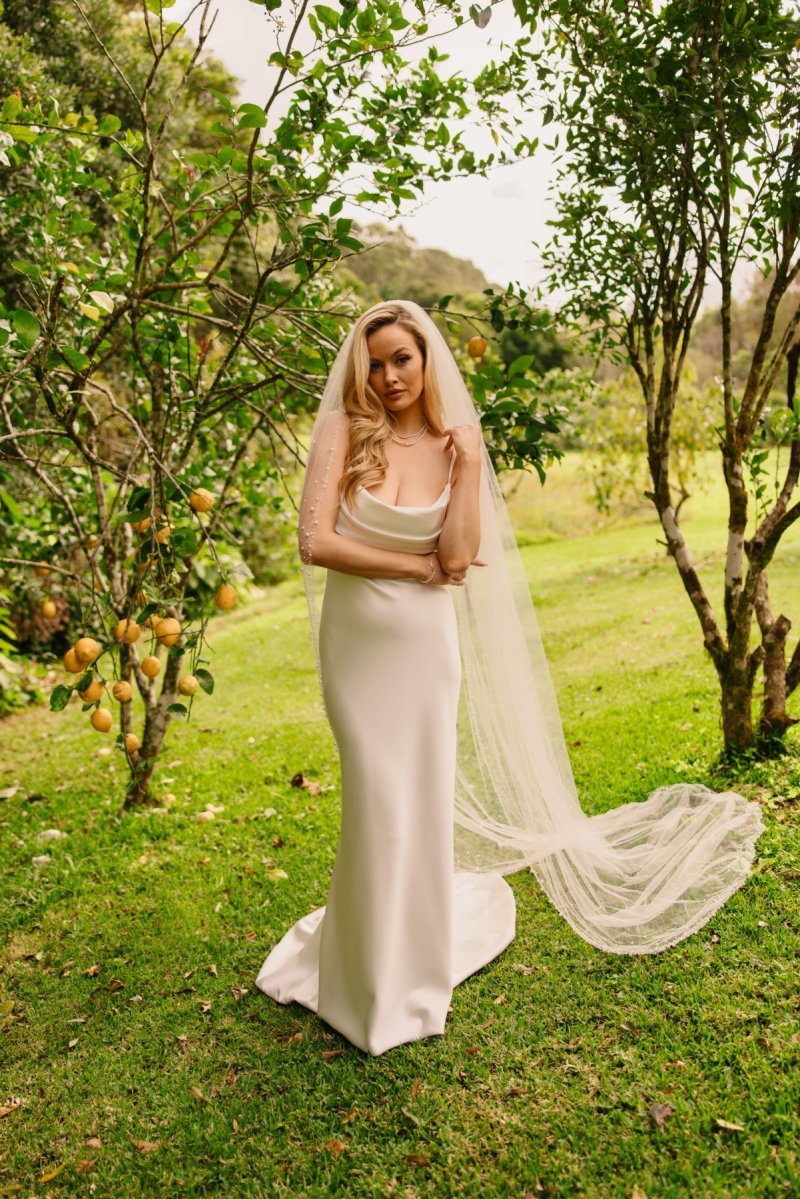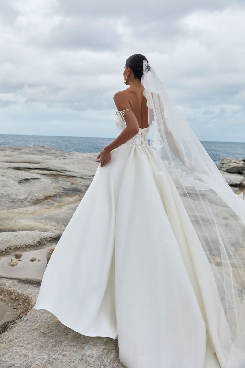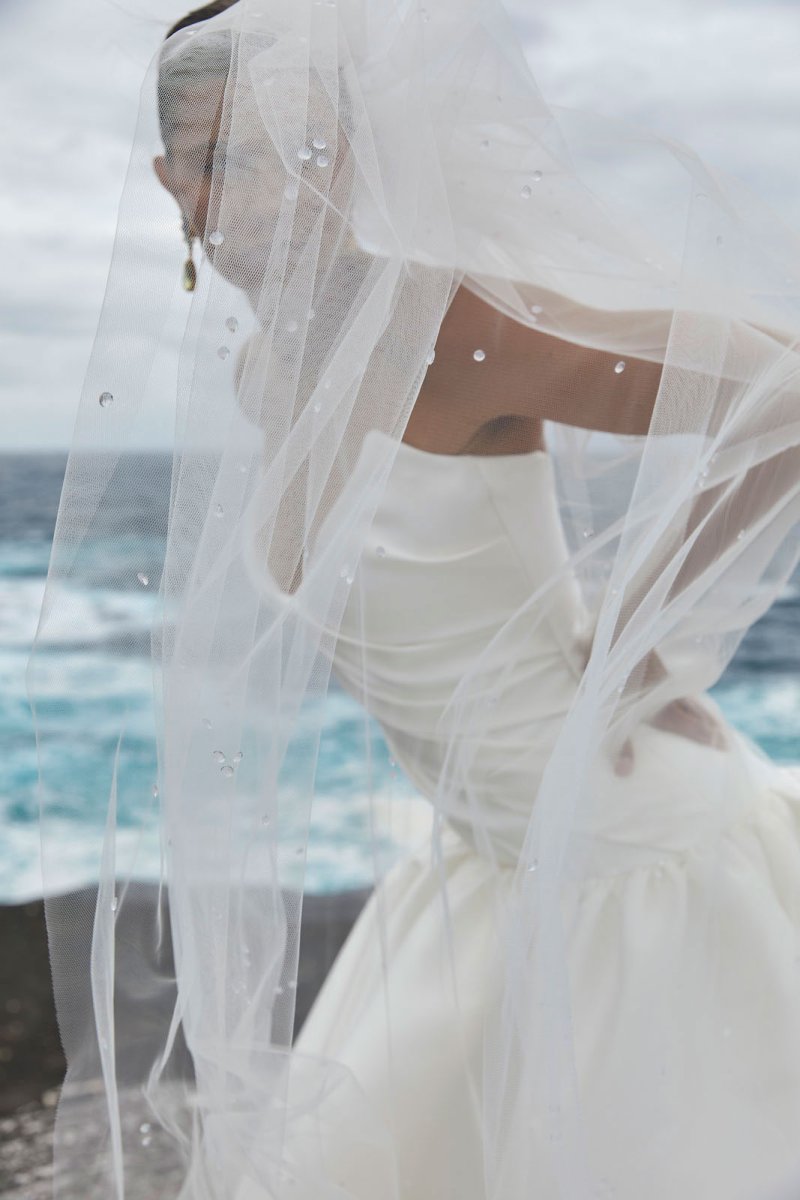 Our dresses are, of course, stunning on their own, but we love when our brides make their looks unforgettable by pairing their gown with a contemporary wedding veil or detachable bridal train.